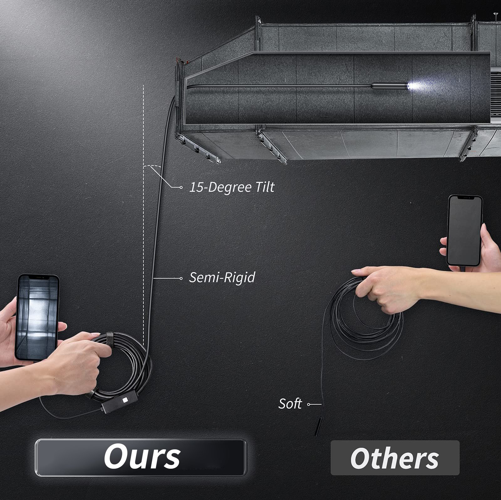 Features a flexible 5m / 16.4ft semi-rigid cable that bends and holds its shape — perfectly balancing flexibility and rigidity to easily reach deep, narrow spaces like vents, engines, and appliances without losing control.