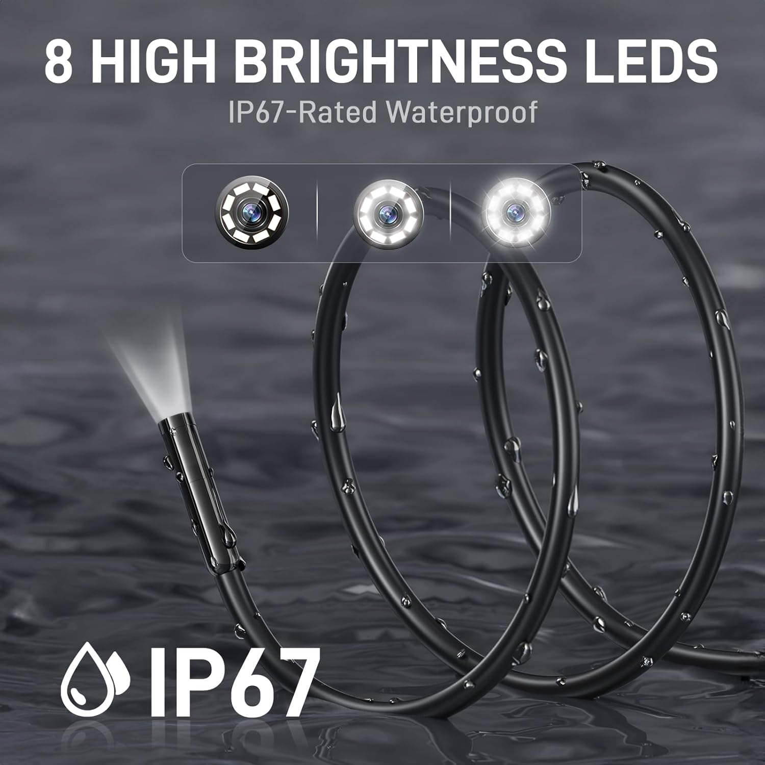 The 8mm Camera Head features 8 Adjustable-Brightness LED Lights and IP67 waterproof protection, making it perfectly usable even in completely dark or underwater environments — ideal for pipes, drains, and outdoor inspections.